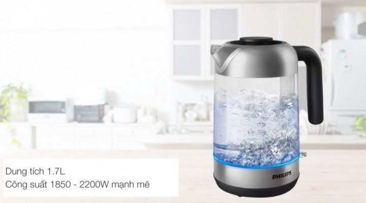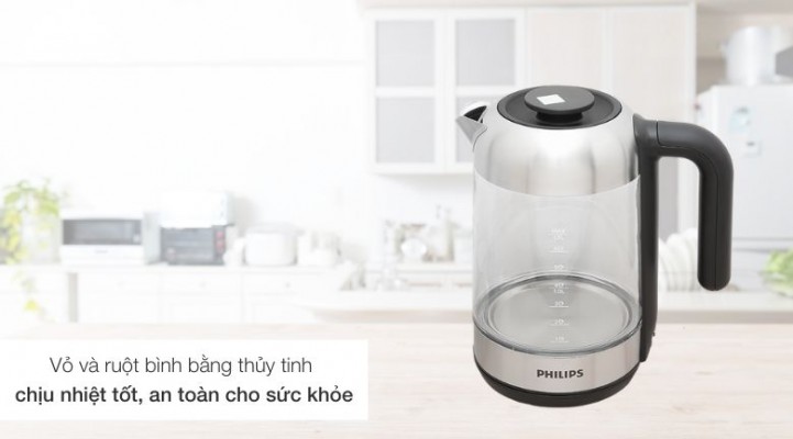 - Công tắc bật/tắt bình đun bằng nút gạt, đèn báo hoạt động màu xanh da trời trang nhã được gắn vào chân đế thủy tinh.