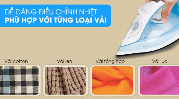 Núm xoay điều chỉnh nhiệt độ ủi dễ dàng, cho người dùng thay đổi 4 cài đặt hơi phun phù hợp với từng chất liệu vải
