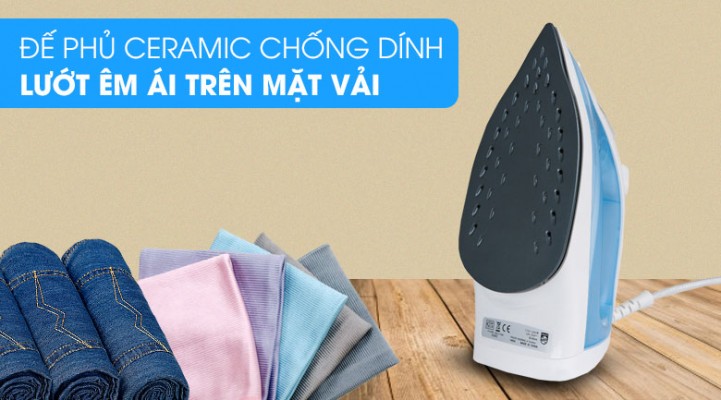 Mặt đế bàn ủi phủ chống dính Ceramic bóng sáng, bền bỉ, lướt êm ái trên mọi mặt vải, dễ vệ sinh