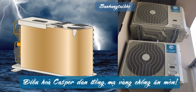 dàn đồng nguyên chất, cánh tản nhiệt đồng mạ vàng giúp tăng hiệu suất làm lạnh, ngăn ngừa sự ăn mòn của nước mưa, muối biển và các tác nhân ăn mòn khác, từ đó tăng độ bền của máy.
