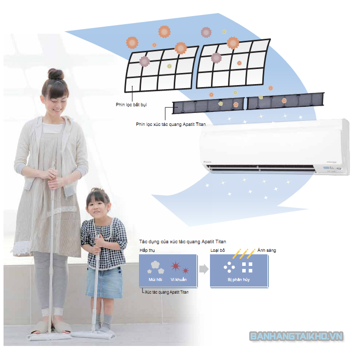 Với máy điều hòa Daikin FTKA50UAVMV bạn hoàn toàn yên tâm bởi Daikin được trang bị tấm lọc Apatit Titan có chức năng khử mùi, ức chế sự phát triển của vi khuẩn và vi rút, loại bỏ bụi bẩn hiệu quả tới 99,9%, mang lại môi trường sống trong lành hơn.