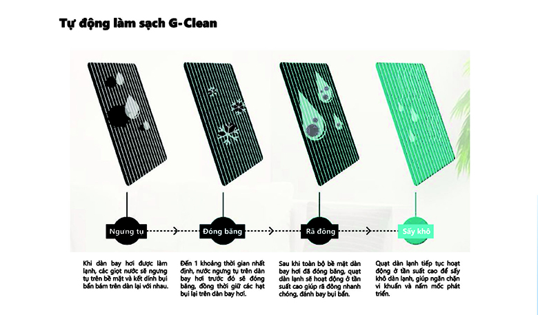 Được trang bị tính năng tự động làm sạch, điều hòa Gree sẽ tự động làm sạch dàn bay hơi một cách dễ dàng và nhanh chóng thông qua 4 bước ” Ngưng tụ – Đóng băng – Rã đông – Sấy khô”, giúp loại bỏ hiệu quả vi khuẩn và nấm mốc.