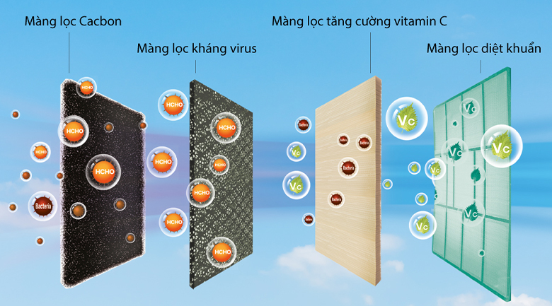 Hệ thống lưới lọc đa chiều Air Fresh trên điều hòa Casper có 4 màng lọc chính: màng lọc Cacbon, màng lọc kháng virus, màng lọc tăng cường Vitamin C và màng lọc diệt khuẩn bắt giữ sẽ loại bỏ bụi bẩn, vi khuẩn và các tác nhân gây hại khác để cho bầu không khí trong lành, sạch khuẩn.