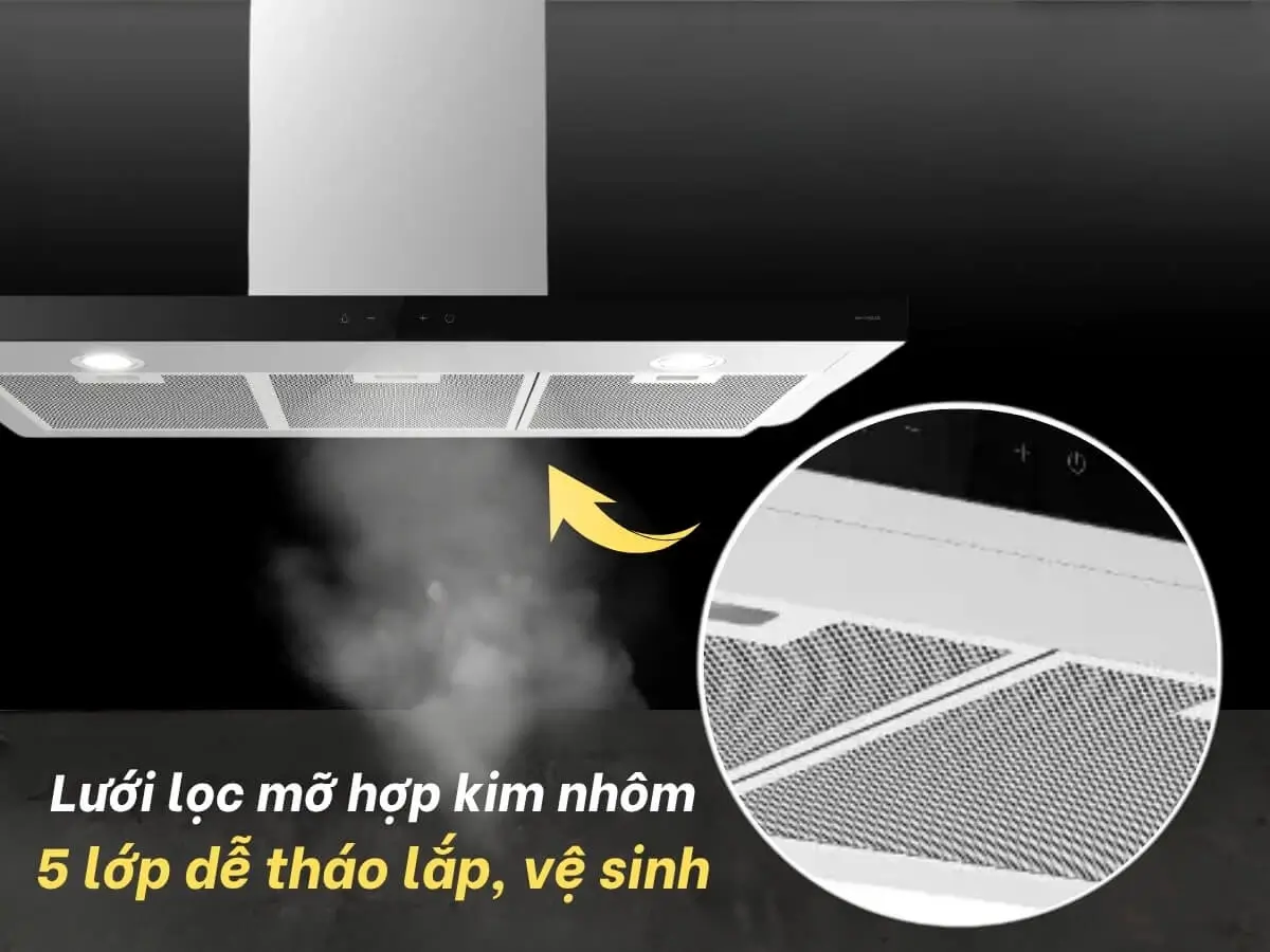 Hệ thống lưới lọc dầu mỡ 5 lớp bằng hợp kim nhôm giúp giữ lại hiệu quả các hạt mỡ trong không khí, bảo vệ động cơ và kéo dài tuổi thọ máy. Đặc biệt, lưới lọc có thể dễ dàng tháo lắp để vệ sinh, giúp bạn tiết kiệm thời gian trong quá trình sử dụng.