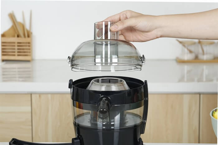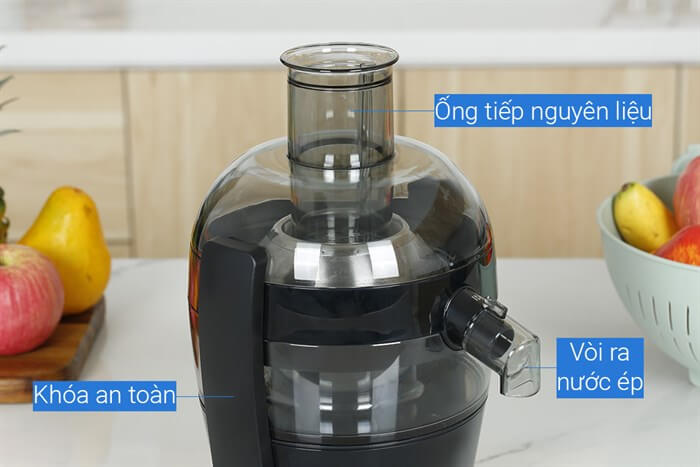 - Thân máy, khoang chứa bã và ống tiếp nguyên liệu bằng nhựa ABS cứng, không giòn và cách điện tốt, có thể làm sạch bằng máy rửa chén.