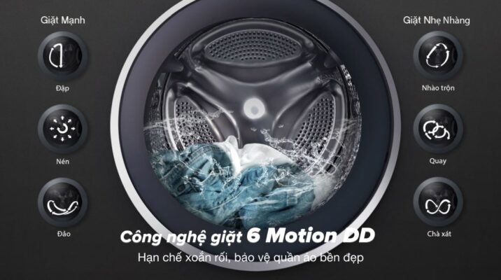 Bằng cách mô phỏng theo các bước giặt bằng tay như đập, nén, đảo, nhào trộn, quay và chà xát, công nghệ giặt 6 chuyển động giúp quần áo vừa sạch sâu mà không bị xoắn rối, giảm thiểu nguy cơ sờn rách sợi vải, đảm bảo quần áo của gia đình được bền đẹp lâu hơn.