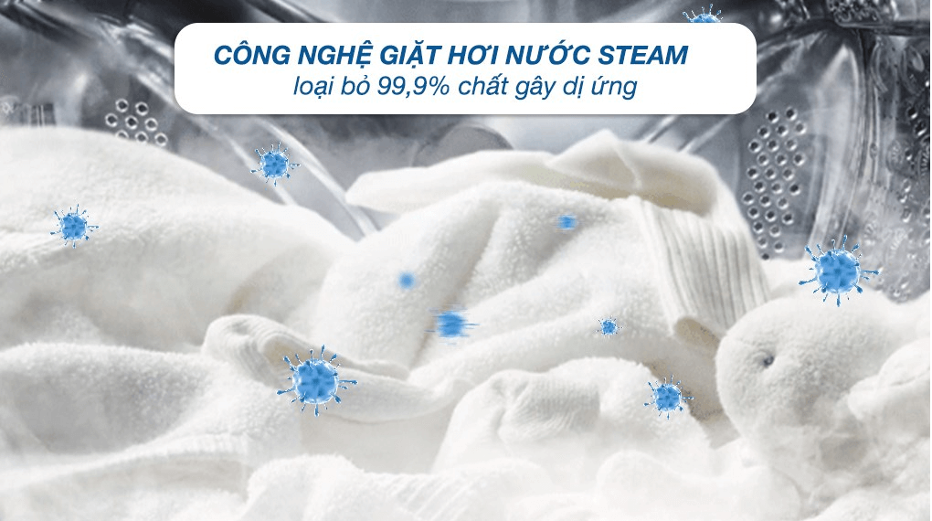 - Hơi nước nóng thẩm thấu sâu vào từng sợi vải, diệt khuẩn và tác nhân gây dị ứng lên đến 99.9%.