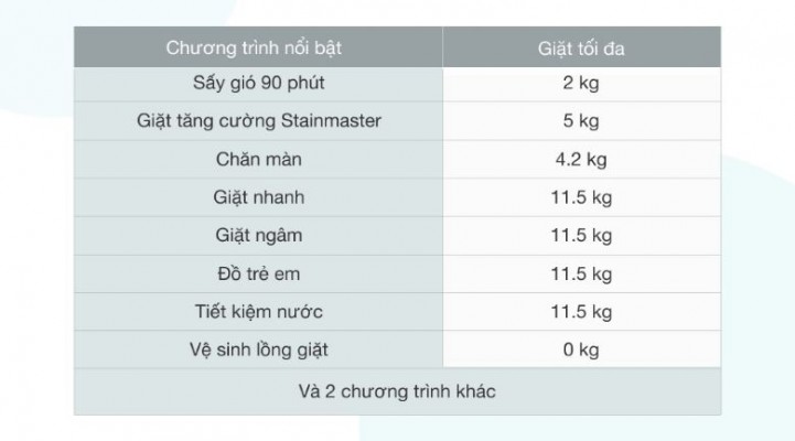 Khối lượng giặt lớn đến 11.5 kg, phù hợp cho gia đình trên 7 người