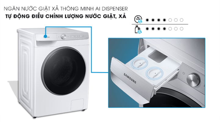 Tự động chiết rót chất giặt, xả phù hợp khối lượng quần áo với ngăn chứa thông minh AI Dispenser
