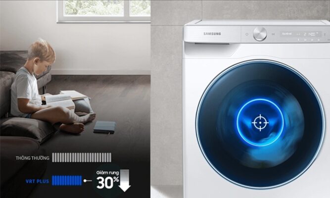 Công nghê VRT Plus được trang bị trên máy giặt Samsung giúp tối ưu hiệu quả vận hành của động cơ, giảm ồn, chống rung đến 30% trong quá trình giặt.