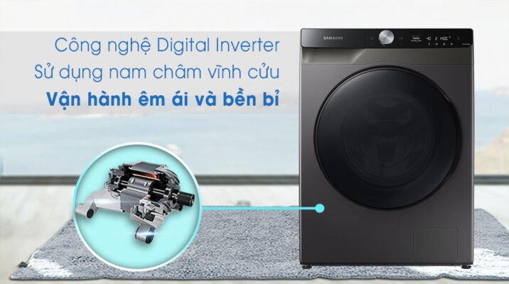 Nhờ trang bị công nghệ Digital Inverter với nam châm vĩnh cửu, giúp chiếc máy giặt Samsung giảm thiểu tình trạng ma sát động cơ khi vận hành, nên hoạt động của máy sẽ trở nên êm ái và sử dụng điện năng một cách hiệu quả hơn.