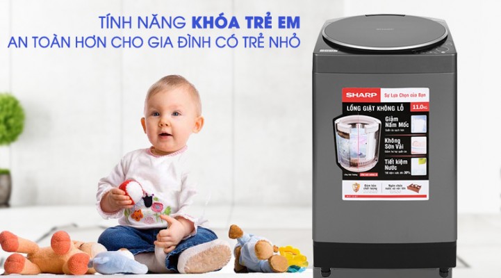 Với tính năng khóa trẻ em trên máy giặt Sharp, cha mẹ sẽ bớt phần nào nỗi lo trẻ hay táy máy nghịch phá, bởi cơ chế bảng điều khiển khi máy đang chạy, cũng như tự xả nước để bảo vệ an toàn nếu lỡ xảy ra sự cố.