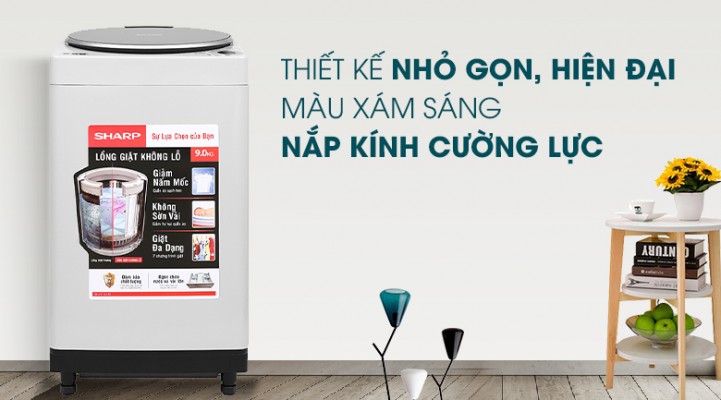 Máy giặt Sharp 9 kg ES-W90PV-H với thiết kế lồng đứng truyền thống, gam màu xám sáng, nắp kính cường lực viền nhựa bạc bo cong nhẹ nhàng, dễ dàng dễ kết hợp với nội thất.