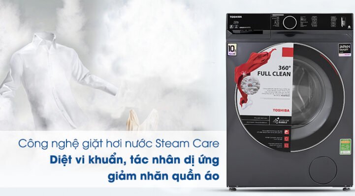 Công nghệ giặt hơi nước Steam Care trên máy giặt Toshiba được CVC Weikai công nhận có thể loại bỏ 99.99% các loại vi khuẩn bám trên quần áo, khử mùi hiệu quả.