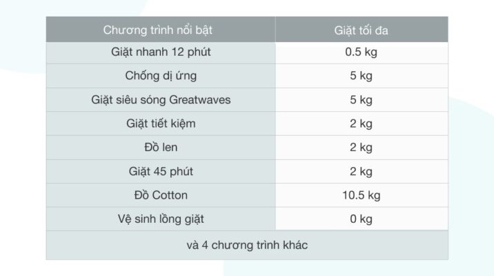 Trong đó, với chương trình giặt chống dị ứng, cả nhà sẽ an tâm hơn khi quần áo được giặt ở nhiệt độ thích hợp, loại bỏ một số tác nhân gây dị ứng, an toàn cho làn da nhạy cảm. (Xem chi tiết tại bảng TSKT).