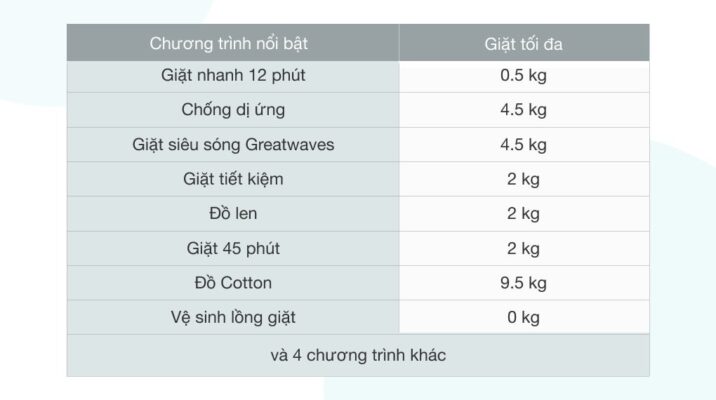 Khối lượng giặt 9.5kg, thích hợp cho gia đình đông người (5 - 7 người)