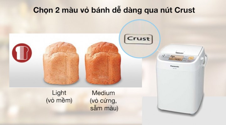 Máy sở hữu chức năng chọn màu vỏ bánh bằng nút bấm "Crust", có 2 màu vỏ bánh để lựa chọn: Light (vỏ mềm) và Medium (vỏ cứng, sẫm màu và giòn)