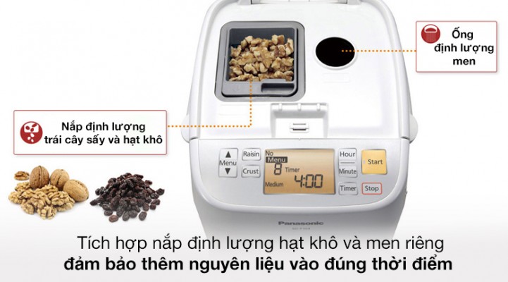Thiết kế nắp định lượng hạt khô và ống định lượng men cho phép bạn bỏ hạt khô và men vào khu vực định lượng riêng biệt trước khi máy bắt đầu chế biến. Sau khi bạn khởi động máy, thiết bị sẽ tự động thêm các nguyên liệu vào khuôn nướng bên dưới vào thời điểm thích hợp.