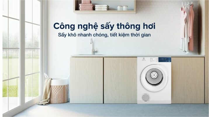 sấy thông hơi, nước đọng lại ở quần áo sẽ được sấy khô bay hơi ra bên ngoài thông qua ống dẫn, do đó cần lựa chọn nơi lắp đặt máy phù hợp (gần cửa sổ) để luồng khí nóng ẩm thoát ra ngoài.