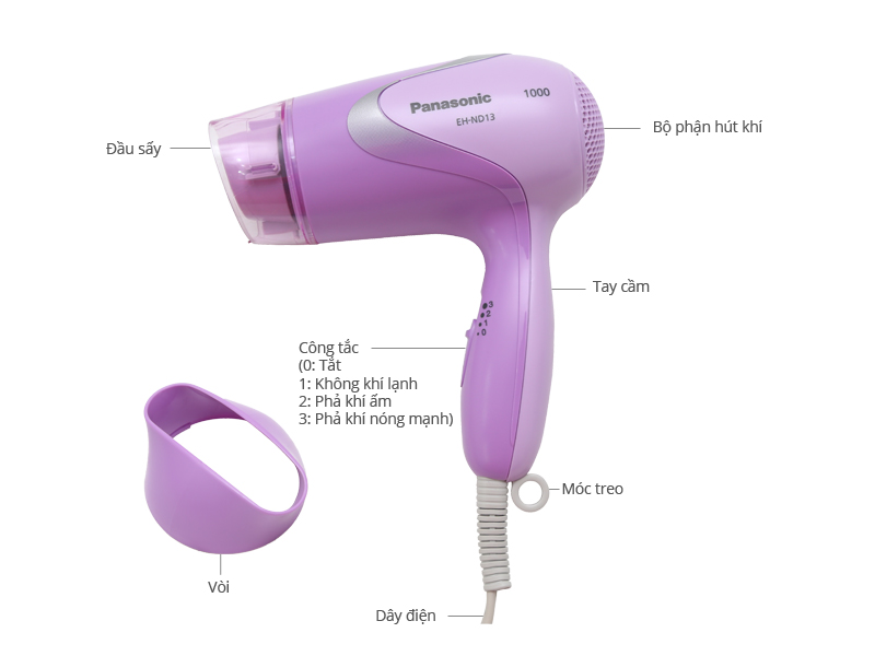 Máy sấy tóc Panasonic EH-ND13-V645 trang bị chế độ sấy mát (số 1) phù hợp khi sấy tóc yếu, mỏng hay sấy tóc cho trẻ nhỏ. Ngoài ra, máy sấy có 2 mức nhiệt sấy nóng (số 2, 3) khi sấy tỏa ra hơi nóng giúp tóc bạn mau khô, hay muốn tạo kiểu nhanh chóng.