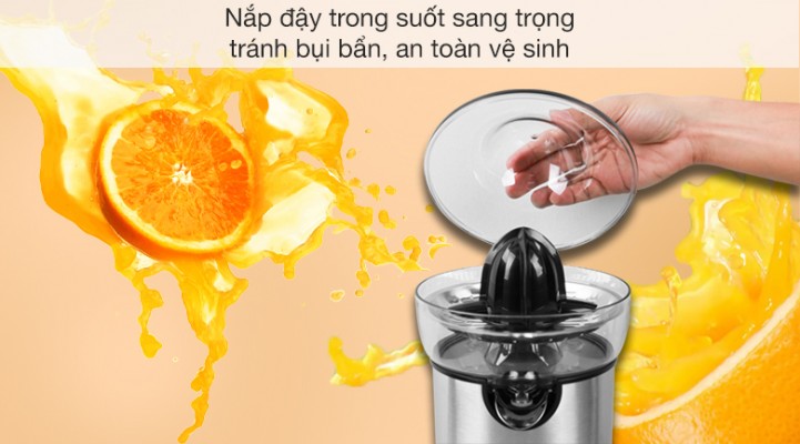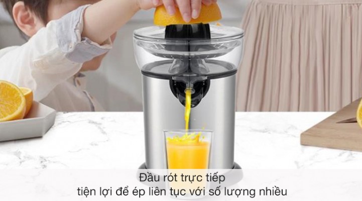 không cần ngừng lại để chuyển nước ép ra ly uống nhiều lần. Sản phẩm thích hợp sử dụng cho nhu cầu kinh doanh ăn uống, gia đình đông người,... có nhu cầu vắt khoảng trên 15 trái cam cho 1 lần.