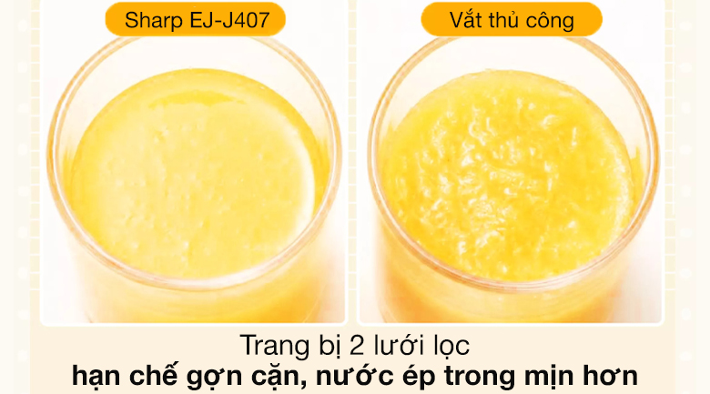 Nhờ vào thiết kế 2 lưới lọc, Sharp EJ-J407-BK có khả năng lọc được phần lớn lượng bã cam sau quá trình vắt, giúp cho ly nước cam được