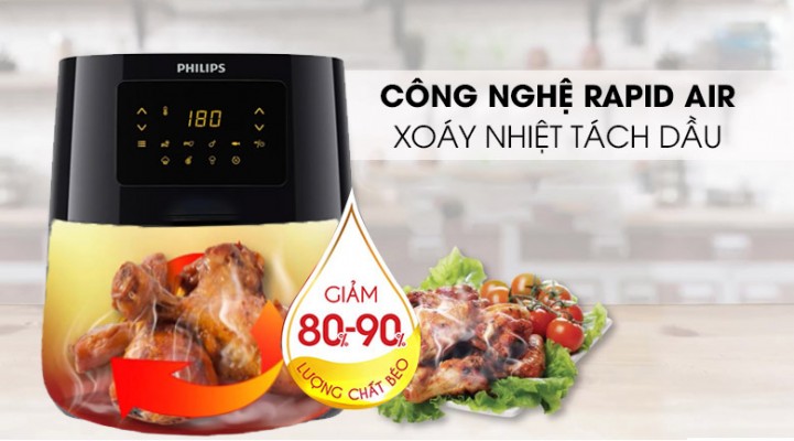 Công nghệ Rapid Air với luồng khí nóng được luân chuyển liên tục đều khắp khay chiên, đối lưu nhiệt tốt, nhanh chóng làm chín đều thực phẩm mà không cần dùng tới dầu hoặc chỉ cần rất ít dầu. Nhờ đó món ăn giảm được tới 90% chất béo, chống ngán tốt, thơm ngon và có lợi hơn cho sức khỏe.