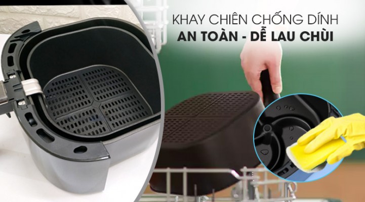 Tích hợp khay chiên, rổ chiên dễ dàng tháo rời, không lo dầu mỡ văng ra ngoài trong quá trình chế biến, dễ vệ sinh, có thể làm sạch bằng máy rửa chén đơn giản