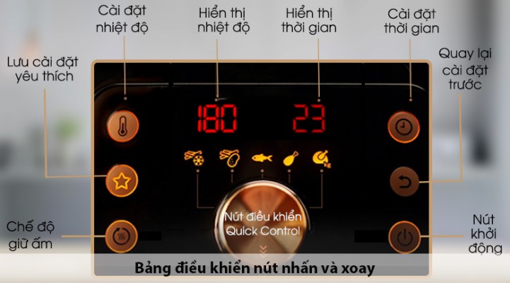 - 1 nút Quick Control dạng xoay kết hợp nhấn: xoay trái/ phải để tăng/ giảm nhiệt độ, thời gian hoặc chọn chế độ nấu phù hợp, sau đó nhấn để hoàn tất quy trình cài đặt.