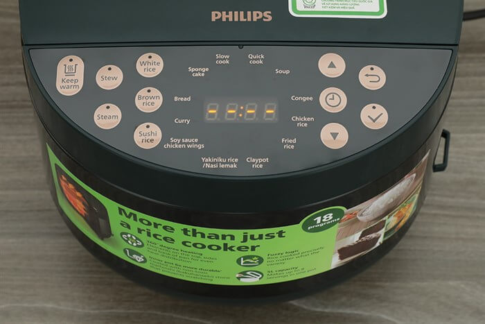 - Mẫu nồi cơm điện Philips này sở hữu vẻ ngoài sang trọng, bóng sáng với phần vỏ kim loại màu xanh đen, kết hợp logo và nút nhấn màu vàng kim, góp phần tạo nên vẻ đẹp hiện đại, thời thượng cho không gian bếp.
