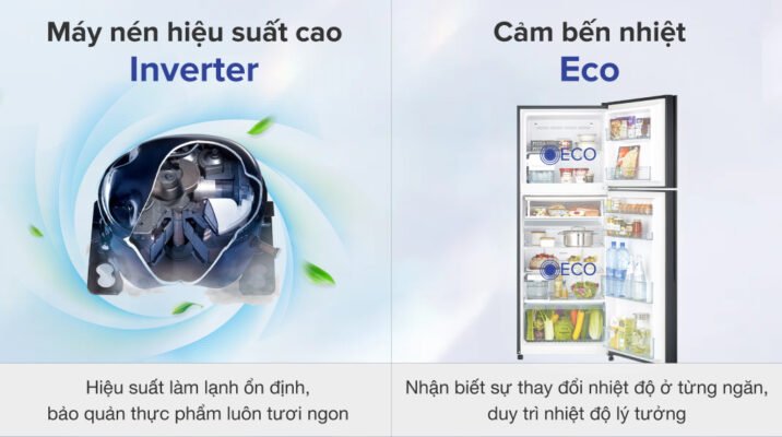 hai cảm biến nhiệt Eco, một cho ngăn đá và một cho ngăn lạnh. Bộ đôi cảm biến này nhận biết sự thay đổi nhiệt độ ở từng ngăn, cho phép duy trì nhiệt độ lý tưởng tại mọi thời điểm.