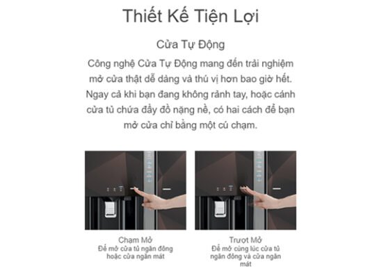 Ở trên cánh tủ có nút chạm cảm ứng, bạn chỉ cần chạm và lướt sang tủ sẽ được tự động mở ra, mang đến trải nghiệm mở cửa thật dễ dàng và thú vị hơn bao giờ hết.