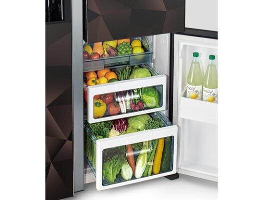 Chiếc tủ lạnh side by side này tích hợp ngăn chứa rau củ quả có khả năng duy trì độ ẩm cao ở mức tối ưu xấp xỉ 90% với luồng khí lạnh thổi gián tiếp để giữ lại độ tươi ngon cho rau củ. Ngăn chứa rau củ quả còn được nâng cấp chia thành các ngăn chứa riêng biệt, giúp bạn có thể bảo quản riêng từng loại rau củ quả của mình.