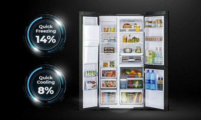 Tủ lạnh Hitachi Inverter 569 lít R-MY800GVGV0(MIR) trang bị công nghệ Inverter giúp tủ lạnh vận hành êm ái, bền bỉ và tiết kiệm điện năng hiệu quả. Hệ Thống Quạt Kép giúp làm lạnh độc lập và hiệu quả cho cả hai ngăn, ngăn lạnh và ngăn đá, mang đến hiệu quả tiết kiệm điện năng tốt hơn và làm lạnh cực mạnh. Tủ lạnh Inverter còn có 2 cảm biến nhiệt độ Eco, một cho ngăn đá và một cho ngăn lạnh. Hai cảm biến này nhận biết sự thay đổi nhiệt độ ở từng ngăn cho phép duy trì nhiệt độ lý tưởng tai mọi thời điểm.