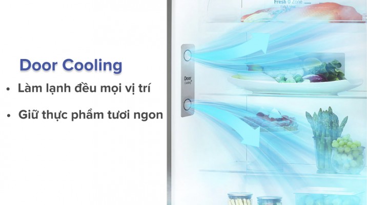 Được trang bị công nghệ làm lạnh từ cánh cửa tủ Door Cooling giúp khí lạnh được thổi đều tại mọi vị trí trong tủ và giúp đồ uống ở cánh tủ lạnh nhanh hơn. Qua đó tiết kiệm điện cho người dùng và giữ thực phẩm luôn tươi ngon khi được bảo quản.
