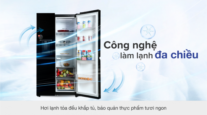 - Hệ thống làm lạnh đa chiều sẽ đem hơi lạnh lan tỏa nhanh chóng đến mọi nơi phía trong tủ, rau củ được bảo quản tươi ngon và lâu hơn.