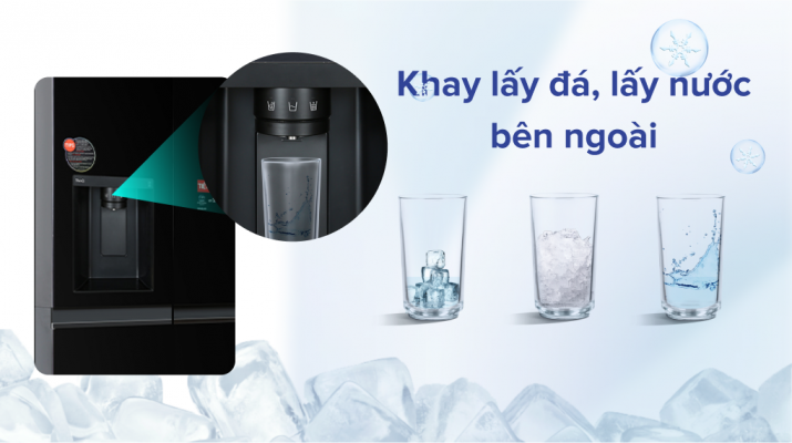- Tủ lạnh có ngăn lấy nước, lấy đá bên ngoài tiện lợi, giúp rút ngắn thời gian chờ đợi để có một ly nước mát lạnh. Đồng thời, tránh lãng phí hơi lạnh và tiết kiệm điện.