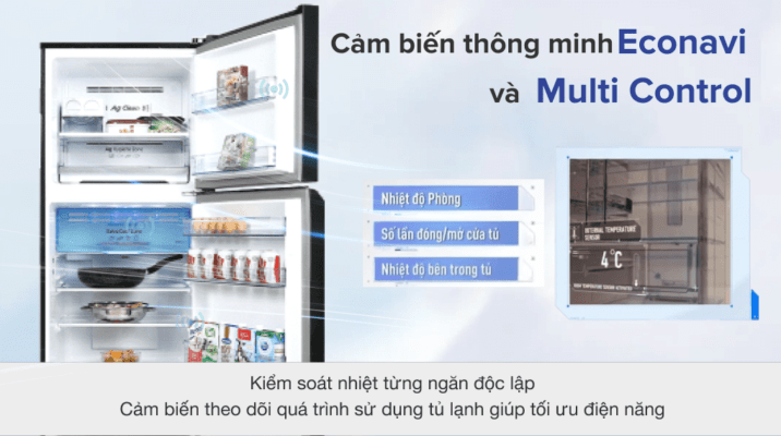Tủ lạnh có công nghệ cảm biến Econavi có khả năng phát hiện tiêu thụ lượng điện thông qua cảm biến khi sử dụng tủ và tự động tối ưu công suất làm lạnh tránh lãng phí điện năng. Kết hợp với máy nén Inverter làm tối ưu hóa hiệu suất sử dụng điện nhằm giảm điện năng tiêu thụ.