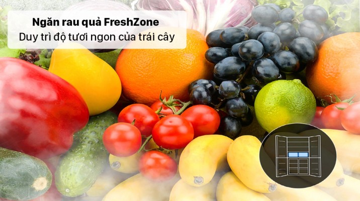 Rau củ được duy trì độ tươi ngon và bảo toàn dưỡng chất nhờ để trong ngăn rau củ FreshZone với thiết kế có nắp đậy kín và tự động kiểm soát độ ẩm phù hợp với thực phẩm. Với thiết kế 2 ngăn, người dùng thoải mái lưu trữ lượng thực phẩm mình muốn.