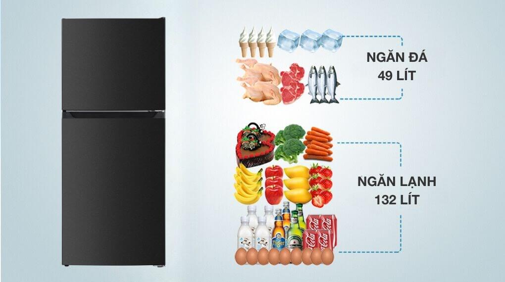- Ngăn lạnh 132 lít: Được chia thành nhiều ngăn nhỏ cùng hộc rau củ quả riêng biệt, giúp bạn dễ dàng sắp xếp và phân loại thực phẩm một cách gọn gàng, hợp lý.
