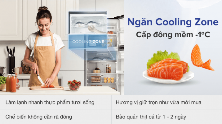 Ngăn lạnh nhanh Cooling Zone có thể giúp thực phẩm tươi sống như thịt cá giữ được chất dinh dưỡng trọn vẹn và chống ôi thiu từ