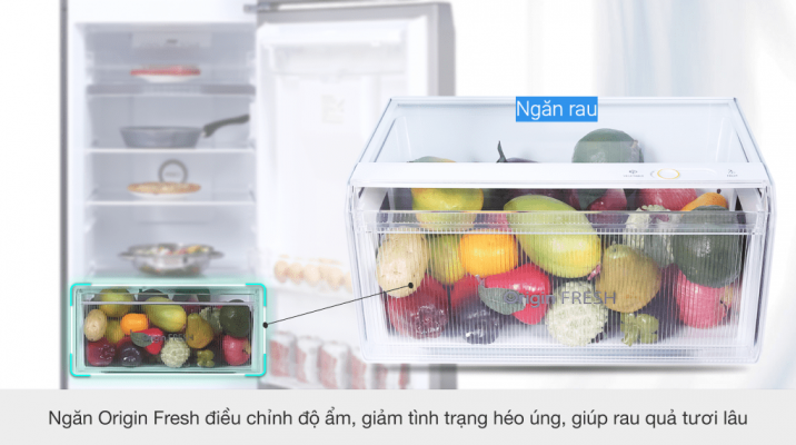 Các loại rau củ quả khi chứa trong ngăn Origin Fresh sẽ có thời gian bảo quản lâu hơn, vì tránh được tình trạng úng hoặc héo do cân bằng được độ ẩm bên trong ngăn với nút tùy chỉnh độ ẩm mà bạn có thể điều chỉnh được.