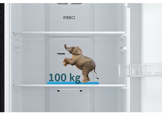 Các khay kệ trong tủ lạnh được làm từ kính cường lực chịu tải 100 kg và có thể thay đổi vị trí linh hoạt nên bạn không cần phải lo lắng chúng sẽ bị nứt/vỡ khi chứa nhiều thực phẩm.