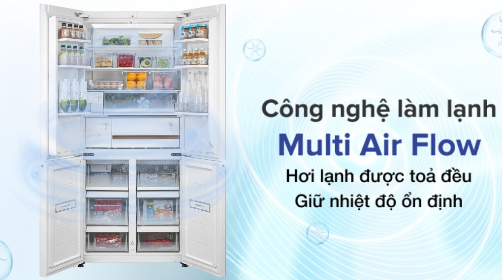 - Luồng khí lạnh đa chiều Multi Air Flow: Phân bổ hơi lạnh đều khắp tủ, giúp thực phẩm được làm lạnh nhanh chóng và đồng đều, đảm bảo độ tươi ngon lâu dài.