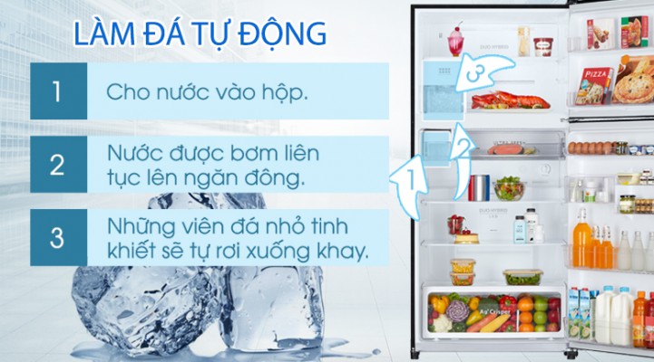 Thêm một tính năng hữu ích của chiếc tủ lạnh Inverter này đó là khả năng tự động làm đá, bạn chỉ cần châm nước vào và đá sẽ được làm sẵn cho vào hộp để bạn sử dụng.
